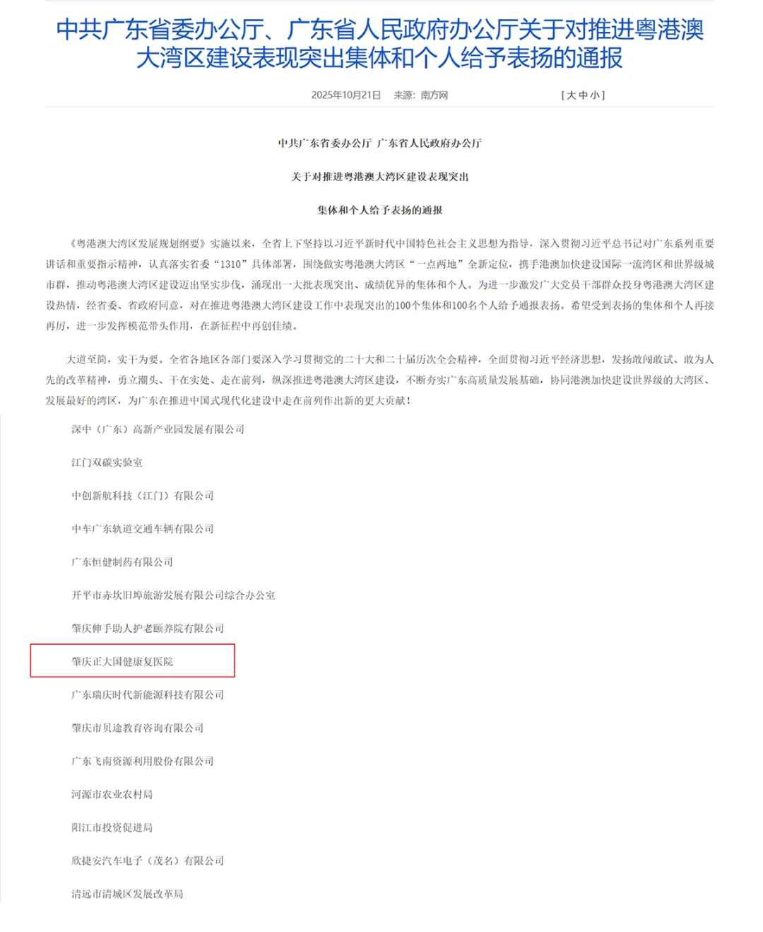 近日,中共广东省委办公厅、广东省人民政府办公厅联合发布通报,对推进粤港澳大湾区建设表现突出的100个集体和100名个人予以表彰。肇庆正大国健康复医院凭借在大湾区建设中的积极贡献与优异表现,成功入选 “表现突出集体” 名单,这是对医院全体同仁不懈努力的高度认可,更是医院服务大湾区民生健康事业的重要里程碑。